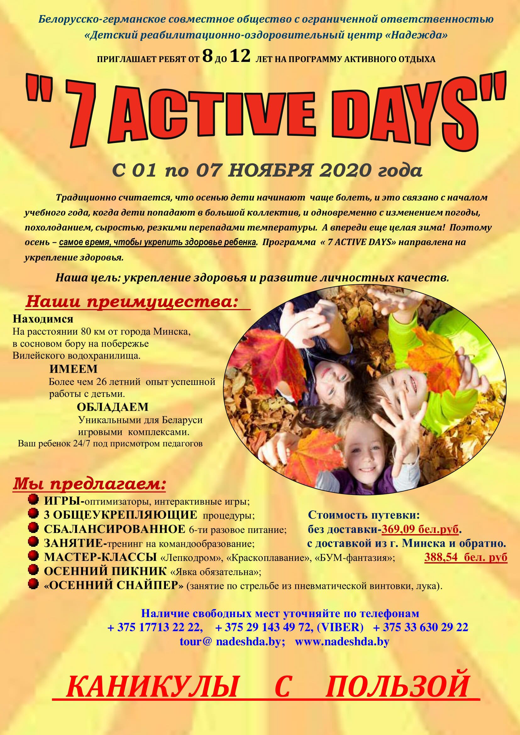 По нашей доброй традиции, постоянный Партнер выставки Детский реабилитационно-оздоровительный центр «Надежда» в этом году вновь предоставляет возможность каждому посетителю выставки испытать удачу и стать участником розыгрыша путевок «Счастливая семья» (для 4-х человек), а так же приглашает ребят от 8 до 12 лет активно и с пользой провести осенние каникулы!